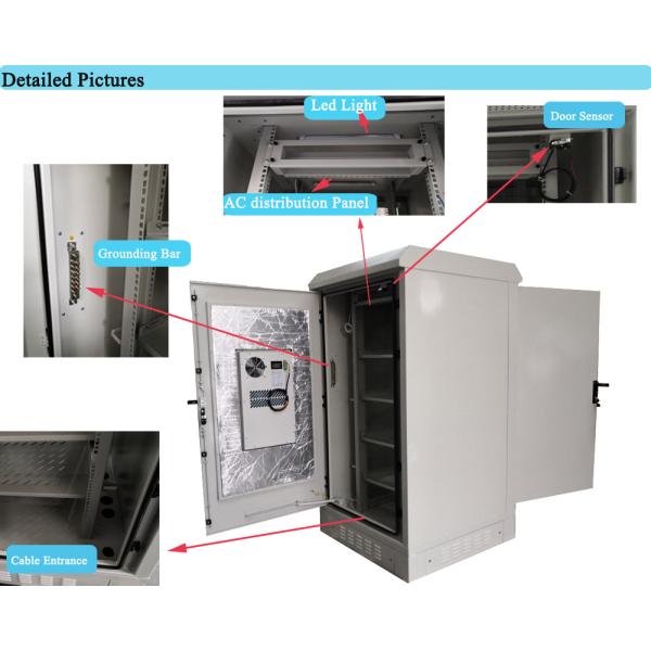 Outdoor telecom enclosure is designed to house a variety of telecommunication equipment with 19’’ rack, the material is stainless steel for anti-rust, it can be applied in the moisture environment such as seaside, air conditioner mounted on the door can keep a stable temperature inside cabinet so as to increase service life and stability of equipment.